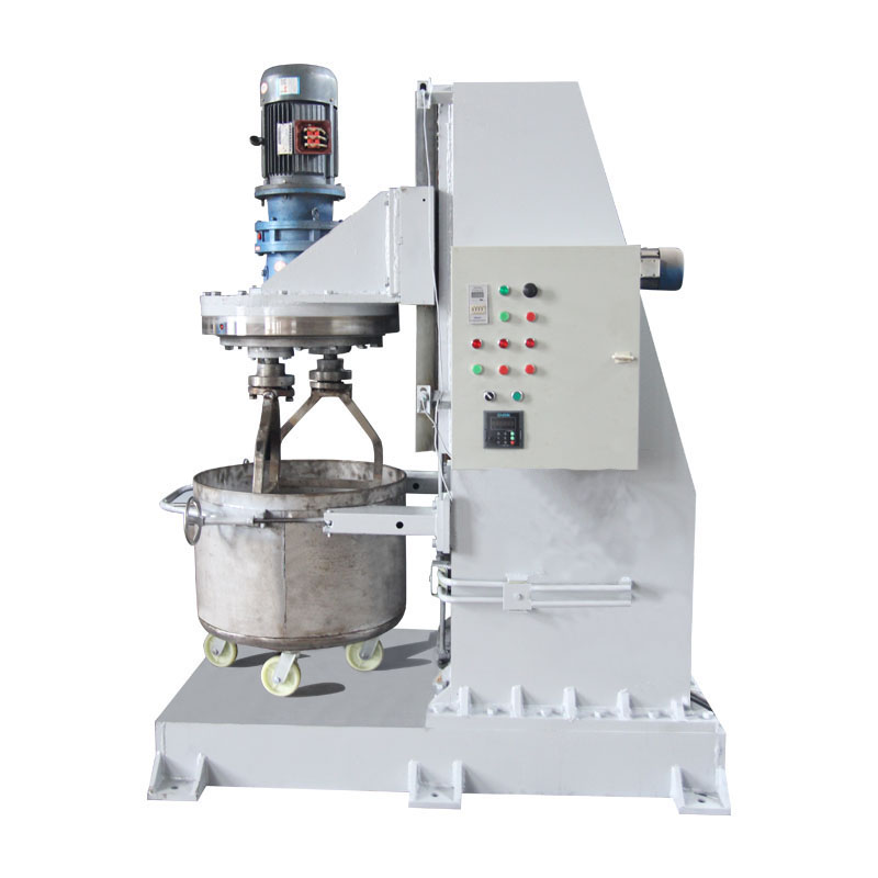 3料筒:物料在不銹鋼材質的料筒內進行攪拌。料筒裝在升降平臺上,通過油缸實現升降。料筒下部裝有滾輪,可以推進。拉出。當攪拌器旋轉時,料筒由擺線針輪減速機通過凸輪和滾輪帶動同時旋轉,旋轉方向可以選擇。控制面板上裝有變頻調節旋鈕,可以根據工藝要求調節旋轉速度。